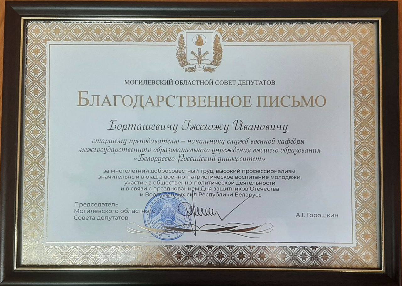 Старший преподаватель – начальник служб военной кафедры Белорусско-Российского университета Барташевич Гжегож Иванович удостоен благодарности Могилевского областного Совета депутатов за многолетний добросовестный труд, высокий профессионализм и вклад в военно-патриотическое воспитание молодежи, участие в общественно-политической деятельности.