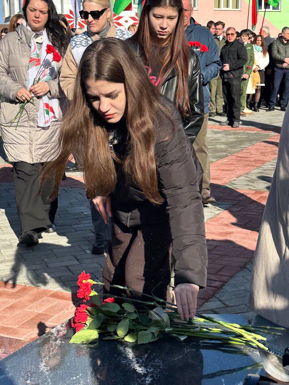 У памятного знака участники акции возложили цветы как символ скорби, уважения и благодарности.